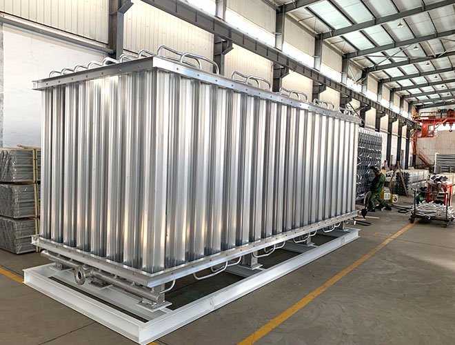高壓空溫氣化器直接安裝在站場(chǎng)內(nèi)部,用以將柱塞泵升壓后的低溫液體通過吸收自然環(huán)境的熱量直接氣化成為高壓氣體,完成液體到氣體的轉(zhuǎn)變。